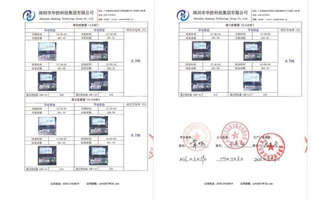 2020年9月,我司于中国石油化工股份有限公司茂名分公司炼油南循环水系统2#1000kVA变压器 配电系统中安装了1 台型号为 HK-400 节电保护装置。安装完成后,双方验收代表依据国家节能监测中心电力节能项目验收方法,并参照国标 GB/T 25099-2010于 2021年3月进行市电供电和节电供电用电量的对比测试,平均节电率为 8.70% 。